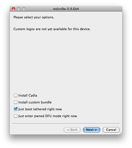 ● If you’ve installed MobileSubstrate tweaks that hook into SpringBoard or other important programs, your boot will actually fail (you’ll get stuck at the Apple logo). You need to use redsn0w to "Just boot tethered right now".